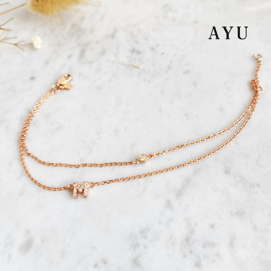 AYU Gelang Emas - Pave Initial Double Layer With Bezel Chain Bracelet 16K Yellow Gold